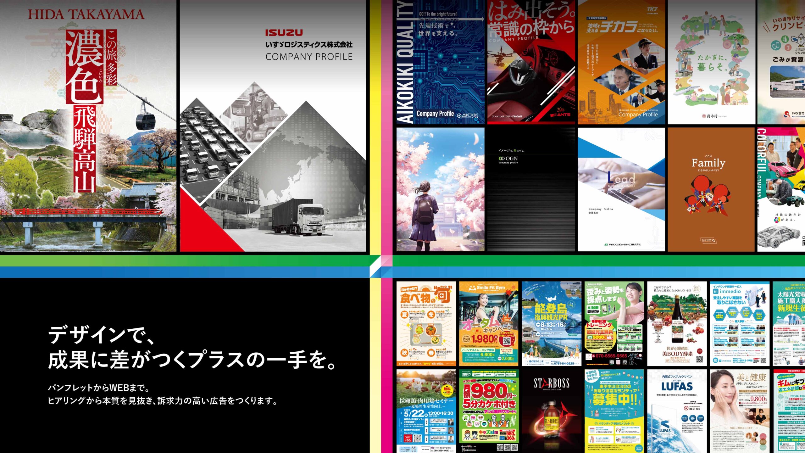 会社案内・パンフ・チラシ・ポスター・名刺・パッケージ/入稿データまで一貫対応。
