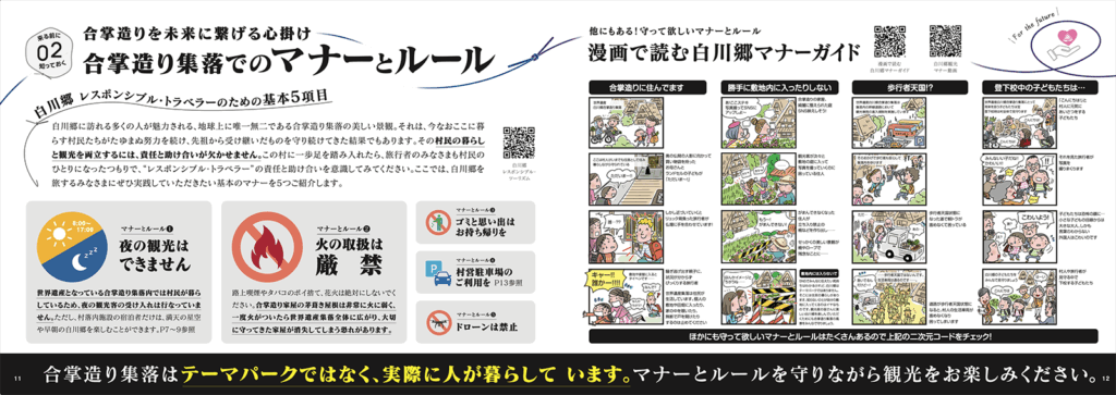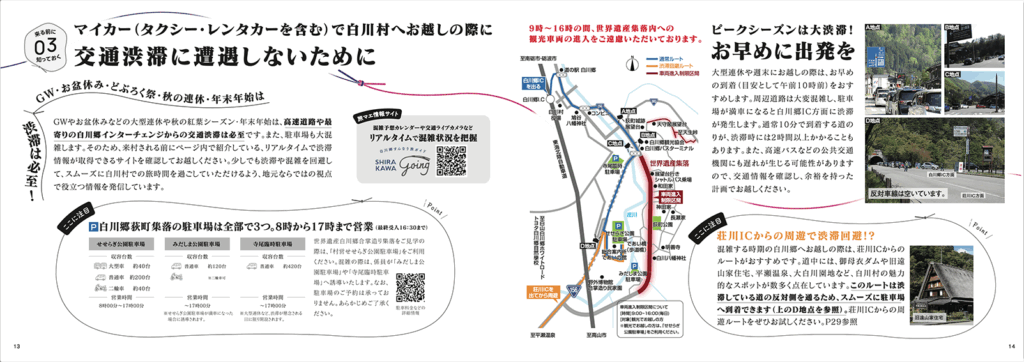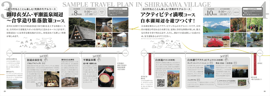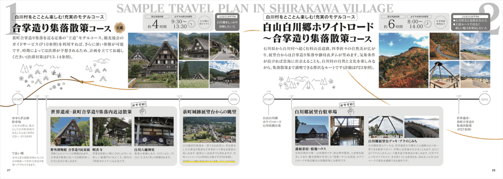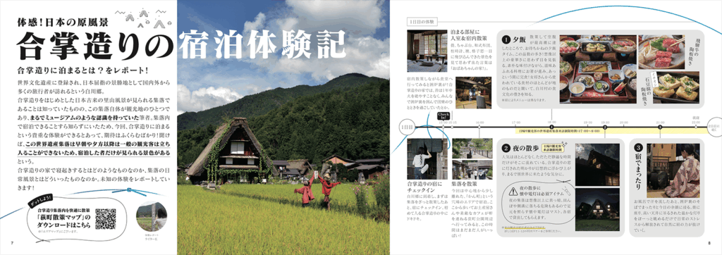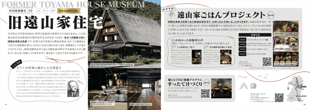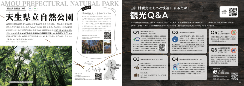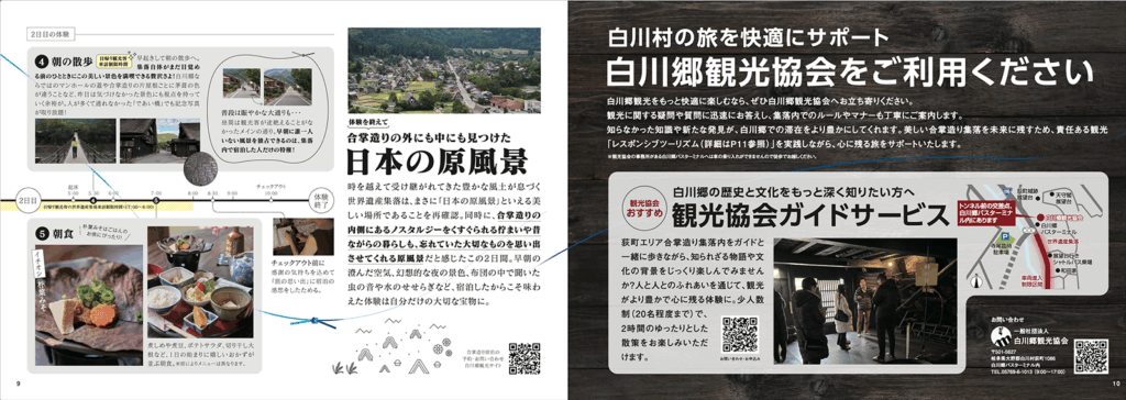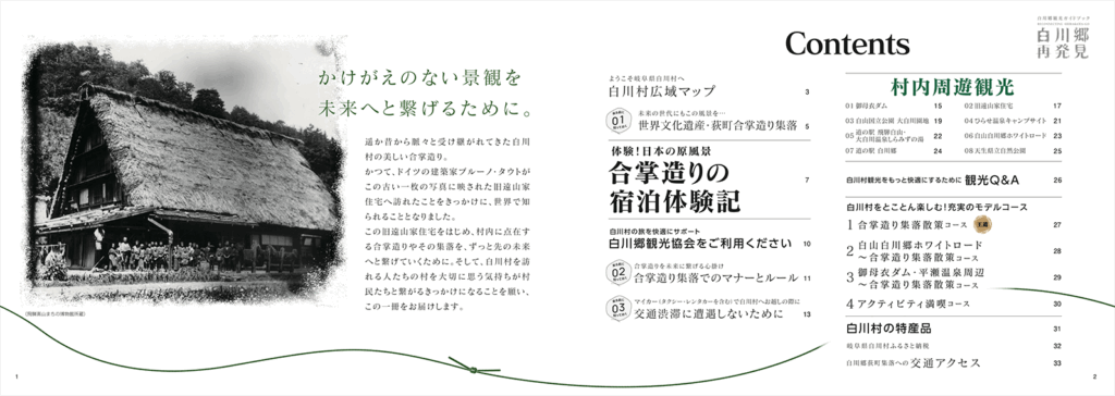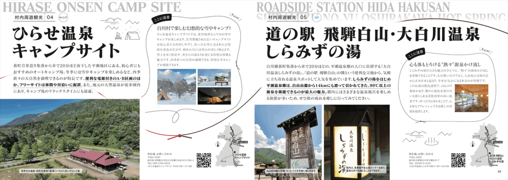 世界遺産・白川郷の魅力を余すことなく伝えるため、合掌造りの集落が紡ぐ歴史や四季折々の風景、訪れる人々に寄り添う地域の温かさを、写真とデザインでわかりやすく表現しています。観光情報としての実用性はもちろん、ページをめくるごとに旅の期待感を高める構成にこだわりました。訪れる方に「また来たい」と思っていただけるような体験をデザインの力でサポートしています。