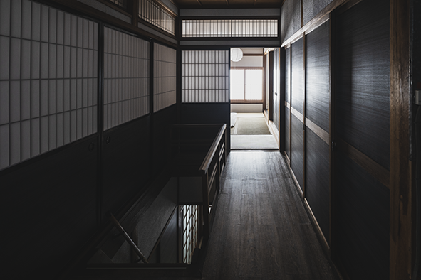 撮影させていただいた建物の廊下に立つと、格子越しに差し込む柔らかな光と、深みを増した木の質感。