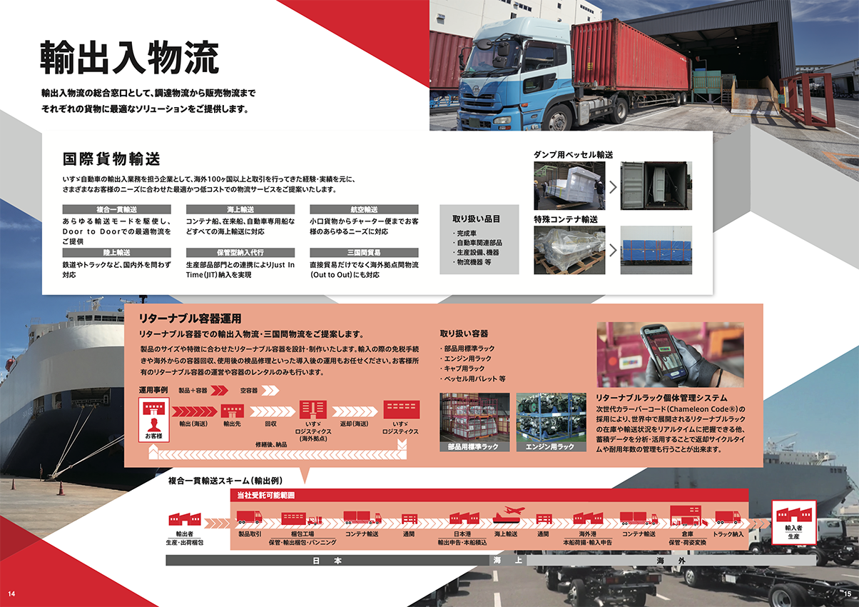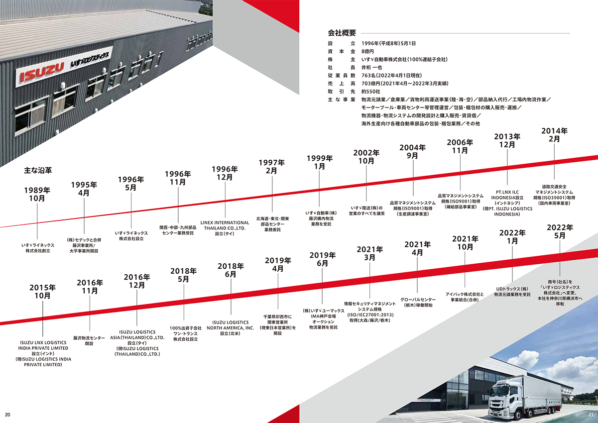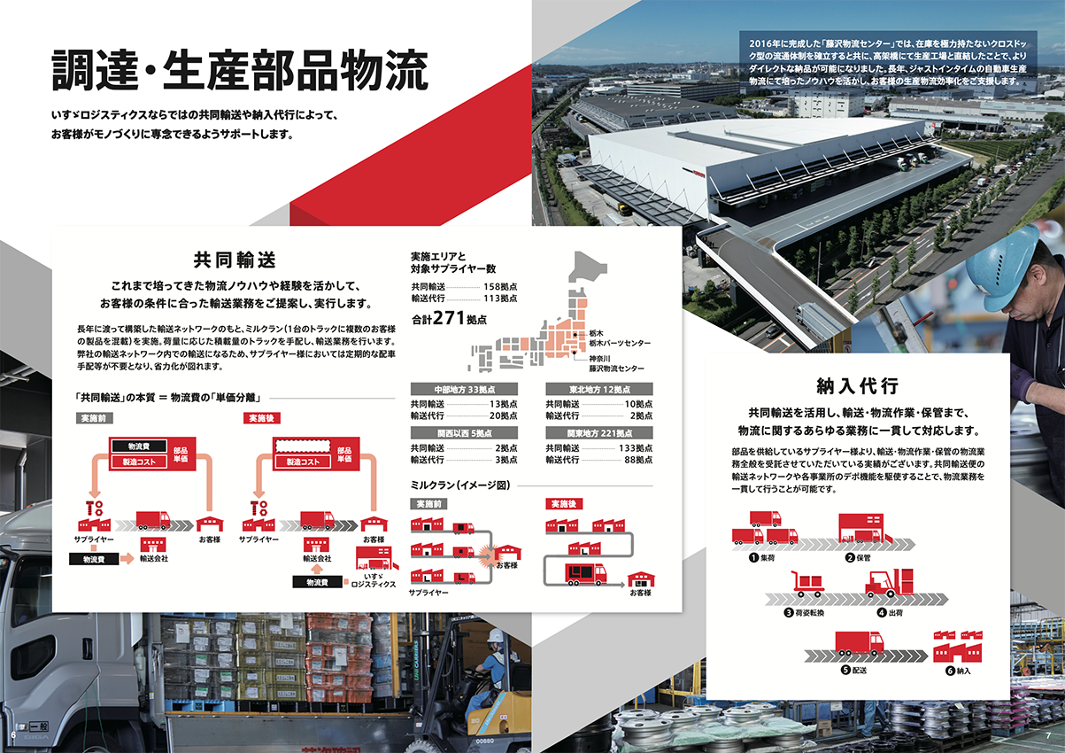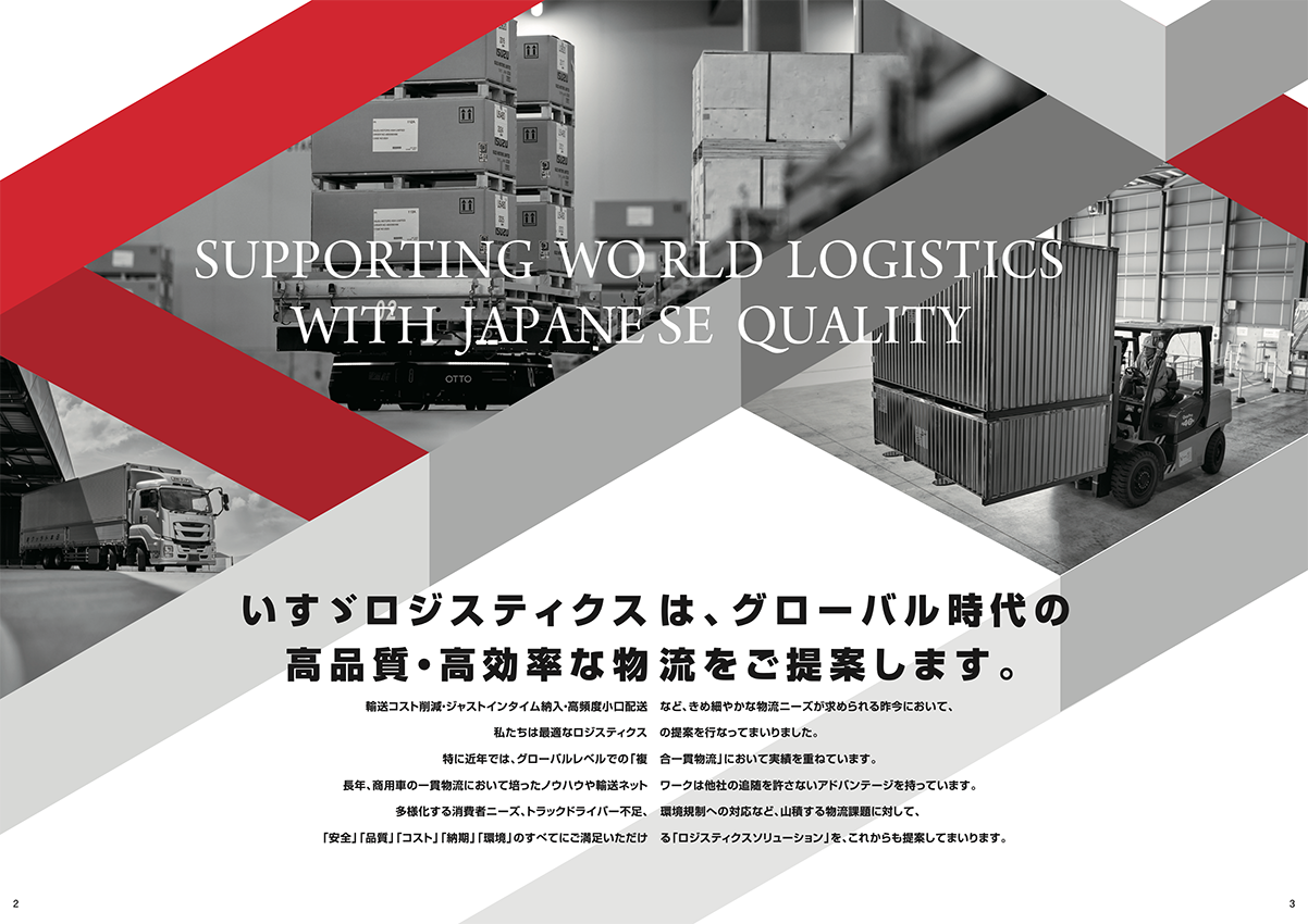 いすゞロジスティクス株式会社の事業内容・強み・実績を、国内外の顧客やパートナーに向けて分かりやすく伝える会社案内です。調達・生産部品物流、サービスパーツ物流、車両物流、輸出入物流、KD梱包生産など、複合一貫物流を軸とした幅広い物流サービスを体系的に整理し、グローバルに展開するネットワークと豊富な実績をビジュアルと図解で紹介しています。