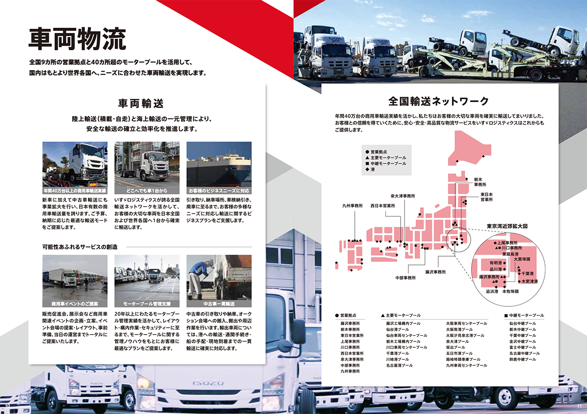 国内外に広がる拠点網や年間40万台を超える車両輸送実績、100事例を超える物流支援実績などを整理し、信頼性・規模感・実行力が伝わる情報設計を重視しました。赤とグレーを基調としたシャープなビジュアル表現により、いすゞグループならではの堅実さと、グローバル物流を支える先進性を両立させています。