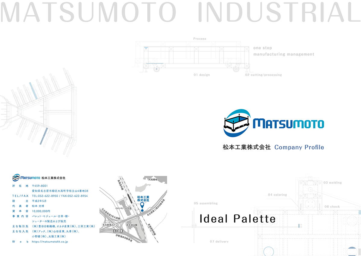 本資料では、パレット製造における品質・安全性・カスタマイズ対応力を明確に伝えるため、製造プロセスと製品バリエーションを段階的に紹介しています。ブルーを基調とした落ち着きのある配色と、設計図や工場写真を組み合わせることで、信頼感と技術力を感じられるビジュアル表現を意識しました。