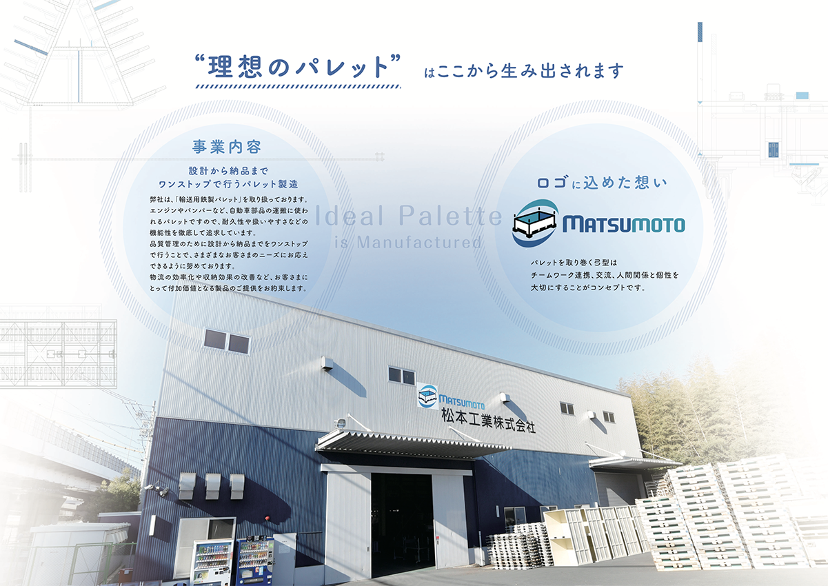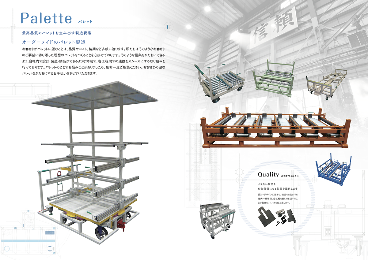 設計から加工・溶接・組立・検査・配送までを一貫して行うワンストップ体制を軸に、オーダーメイドによるパレット製造を中心としたものづくりの姿勢を紹介しています。