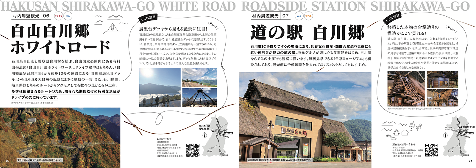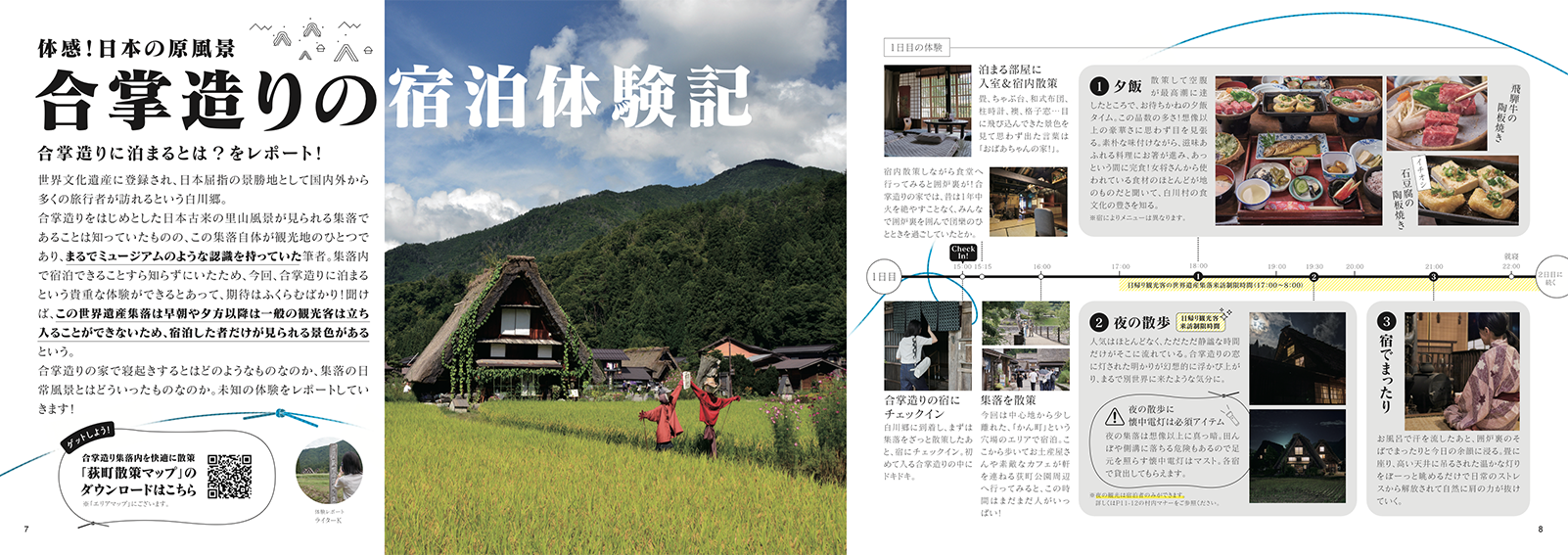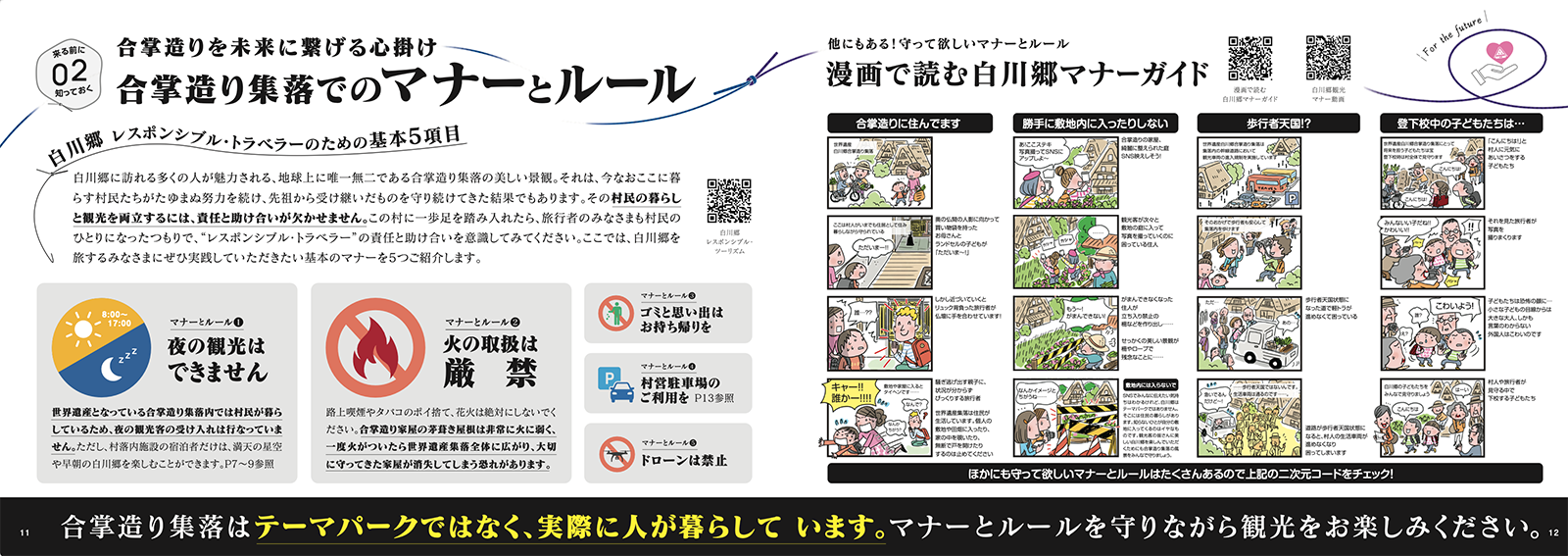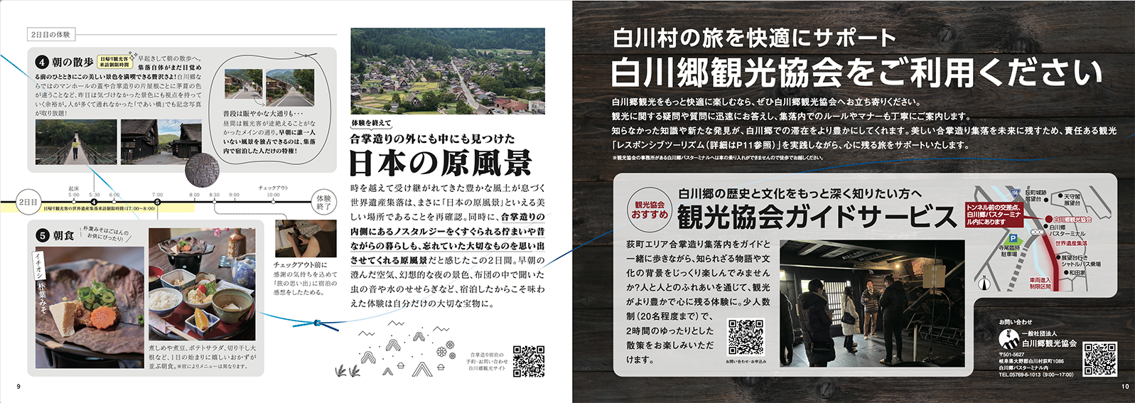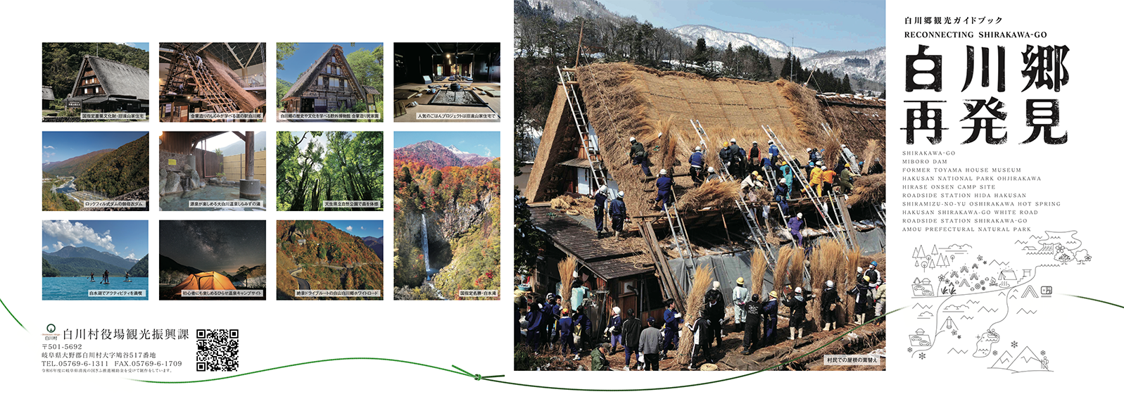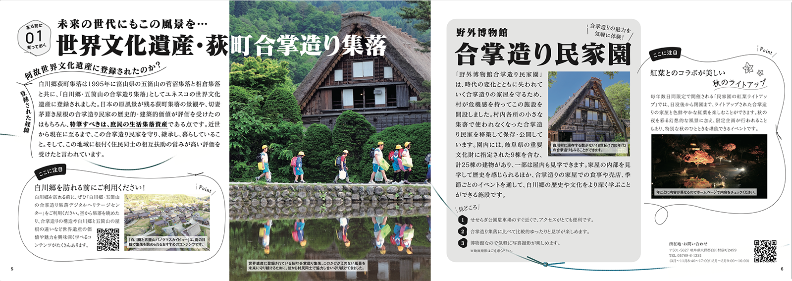 世界遺産・白川郷を「観光地」として消費するのではなく、いまも人が暮らし続ける“生きた集落”として体験してもらうことを目的とした総合観光パンフレット。合掌造り集落の魅力紹介に加え、宿泊体験、早朝・夜の風景、村内周遊スポット、交通・混雑対策、そして観光マナーまでを網羅し、初訪問者からリピーターまで幅広く活用できる構成としています。