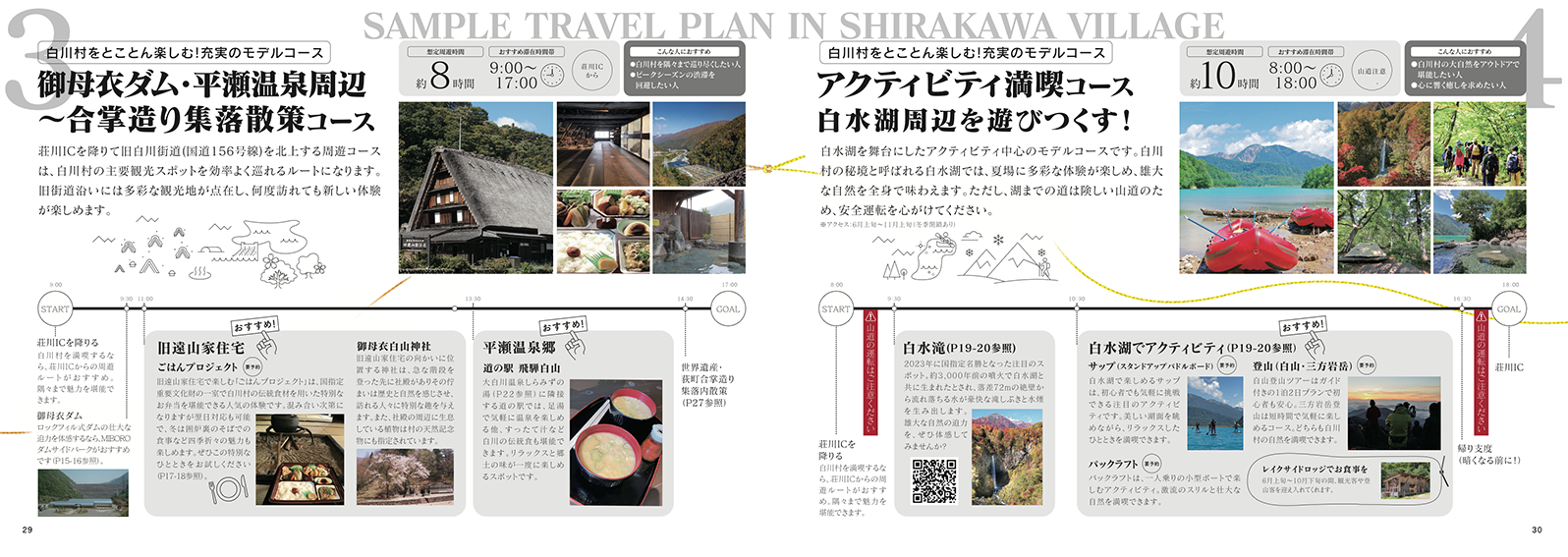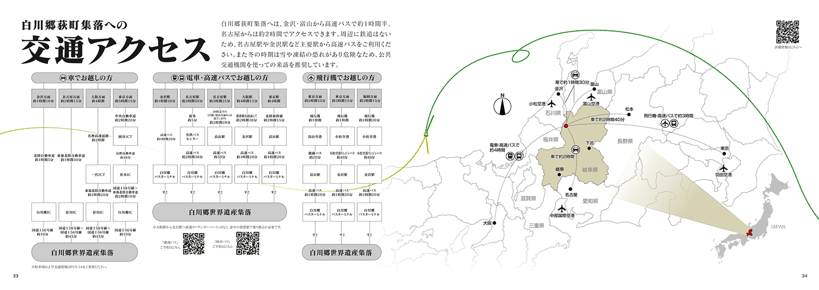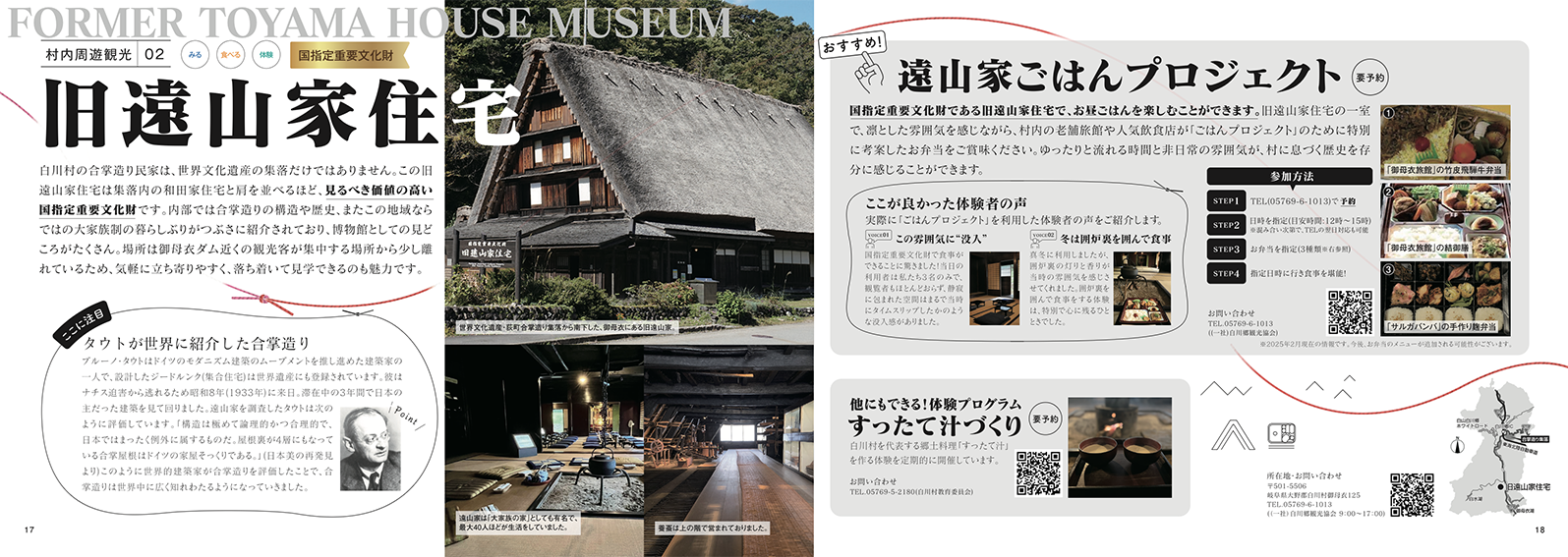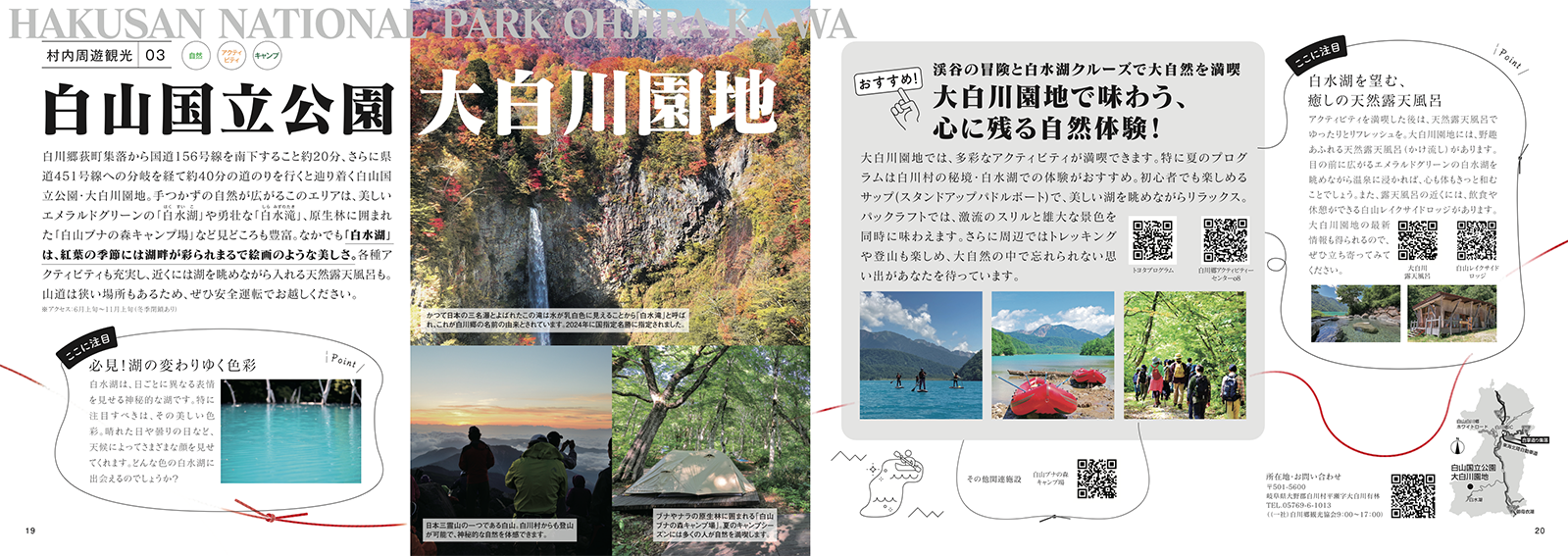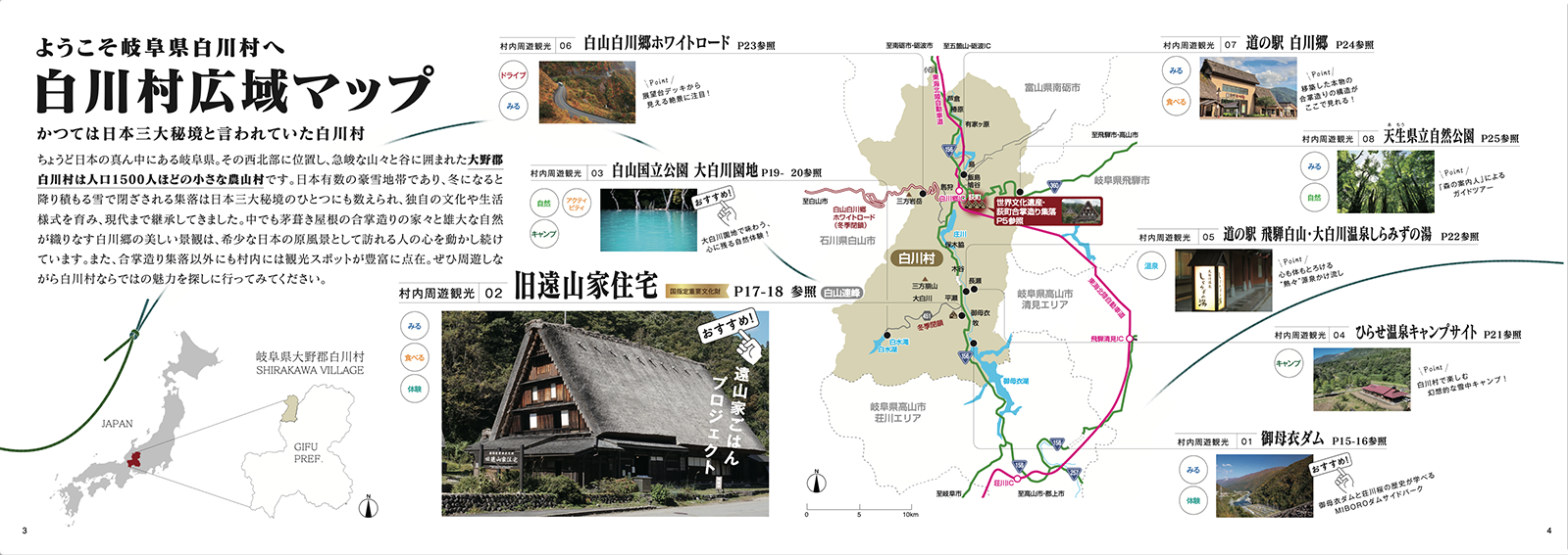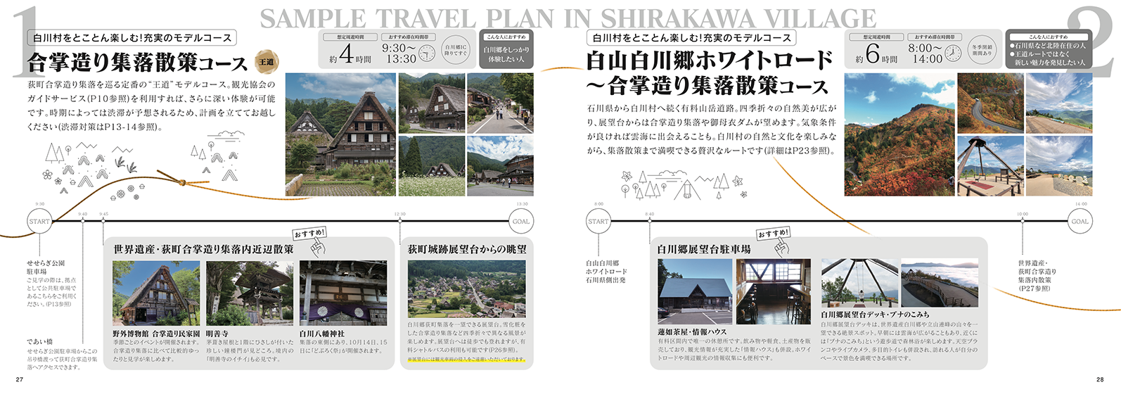 世界遺産・白川郷を「観光地」として消費するのではなく、いまも人が暮らし続ける“生きた集落”として体験してもらうことを目的とした総合観光パンフレット。合掌造り集落の魅力紹介に加え、宿泊体験、早朝・夜の風景、村内周遊スポット、交通・混雑対策、そして観光マナーまでを網羅し、初訪問者からリピーターまで幅広く活用できる構成としています。