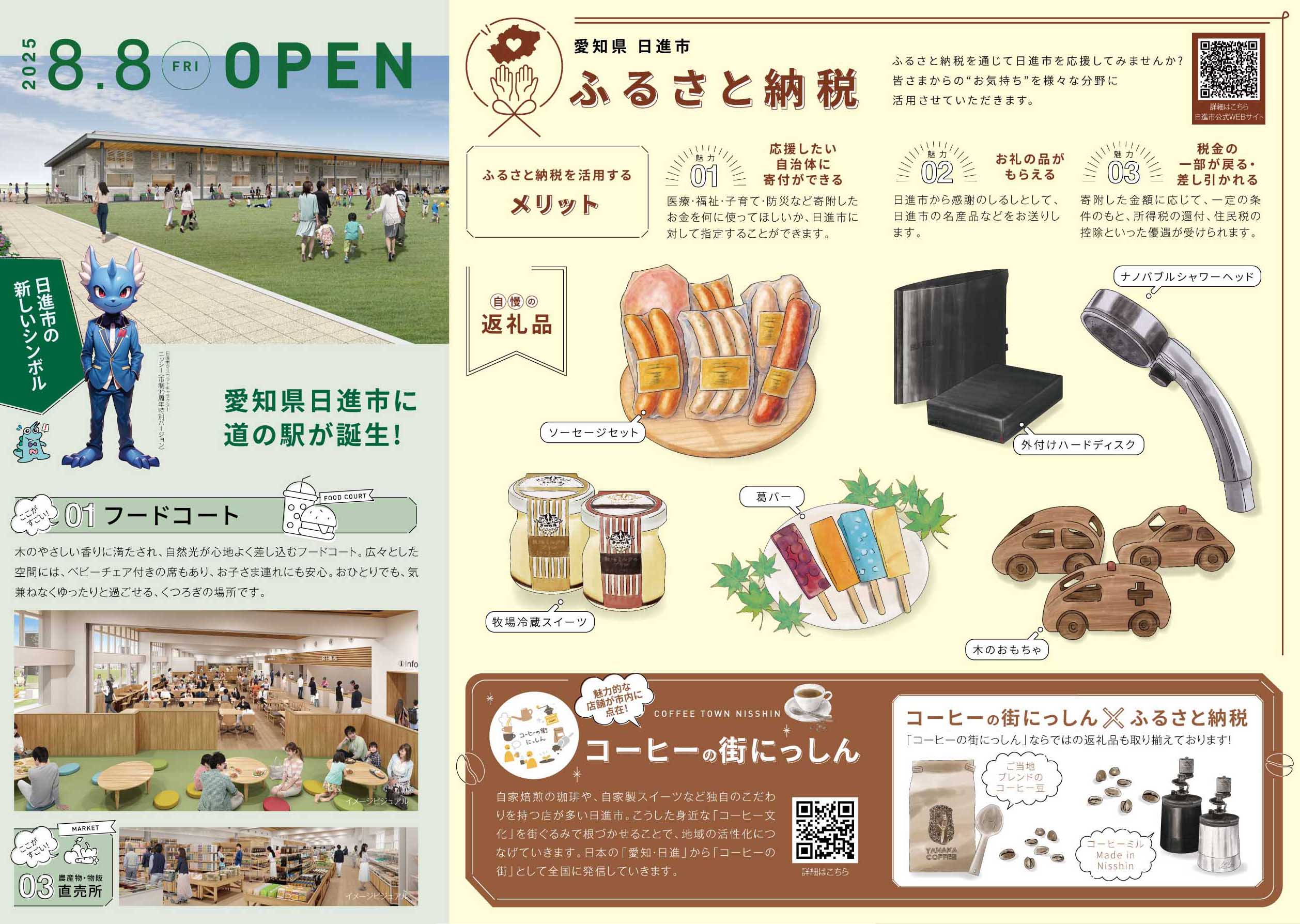 既存観光マップの使いやすさを活かしつつ、最新の情報とデザインで“今の日進市”を伝えるリニューアル版パンフレットを制作しました。新たにOPENした「道の駅 マチテラス日進」を中心に、ふるさと納税の返礼品紹介や“コーヒーの街 にっしん”など、市の魅力を多面的に発信。