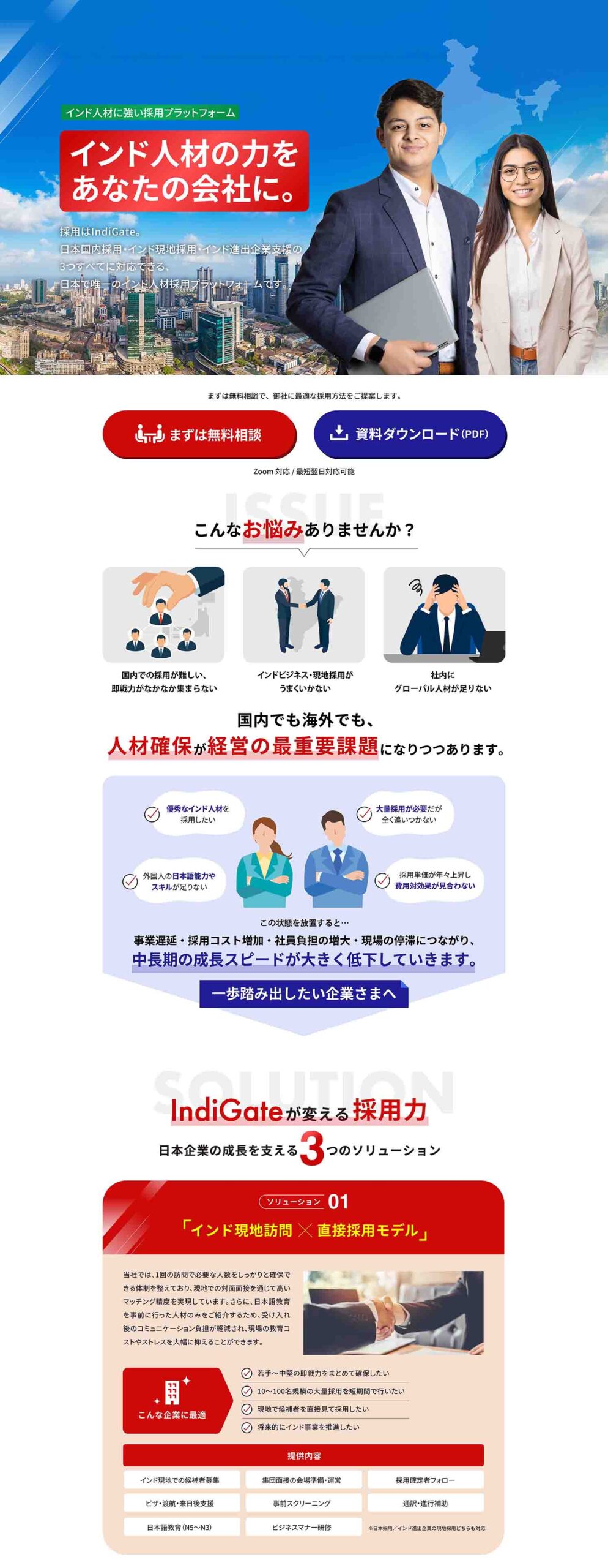 Indobox様が展開するインド人材採用支援サービス「IndiGate」は、インド人材と日本企業をつなぐ価値ある取り組みである一方、その魅力や強みが十分に整理されておらず、初めて検討される企業様にとってはやや伝わりにくい部分がありました。また、サービス内容が多岐にわたるため、「どのような企業に、どのような支援が可能なのか」をより分かりやすく届けるための情報設計が求められていました。