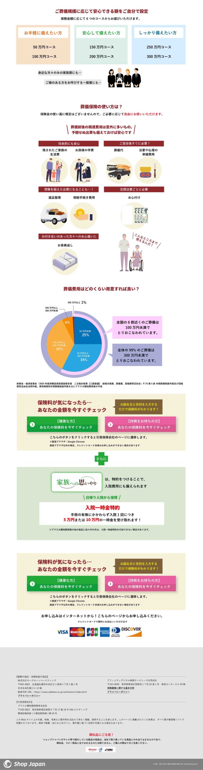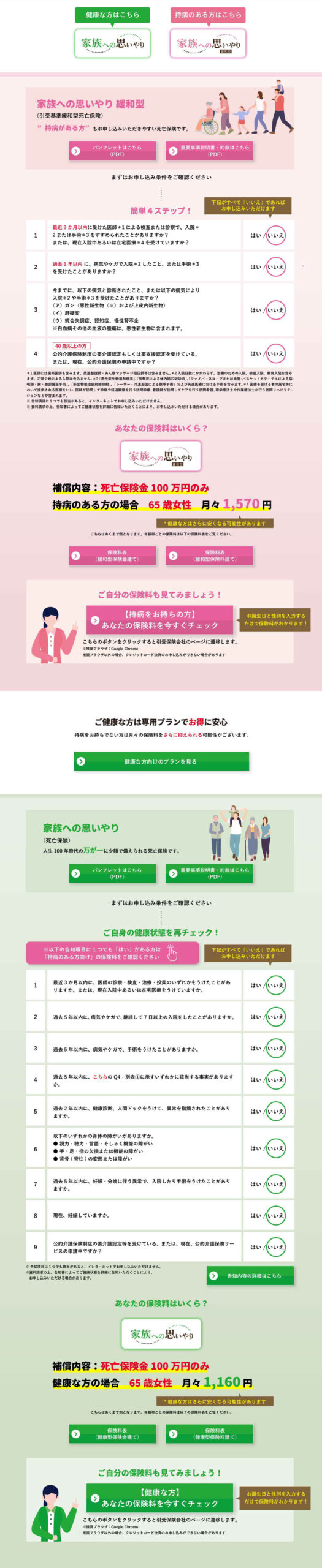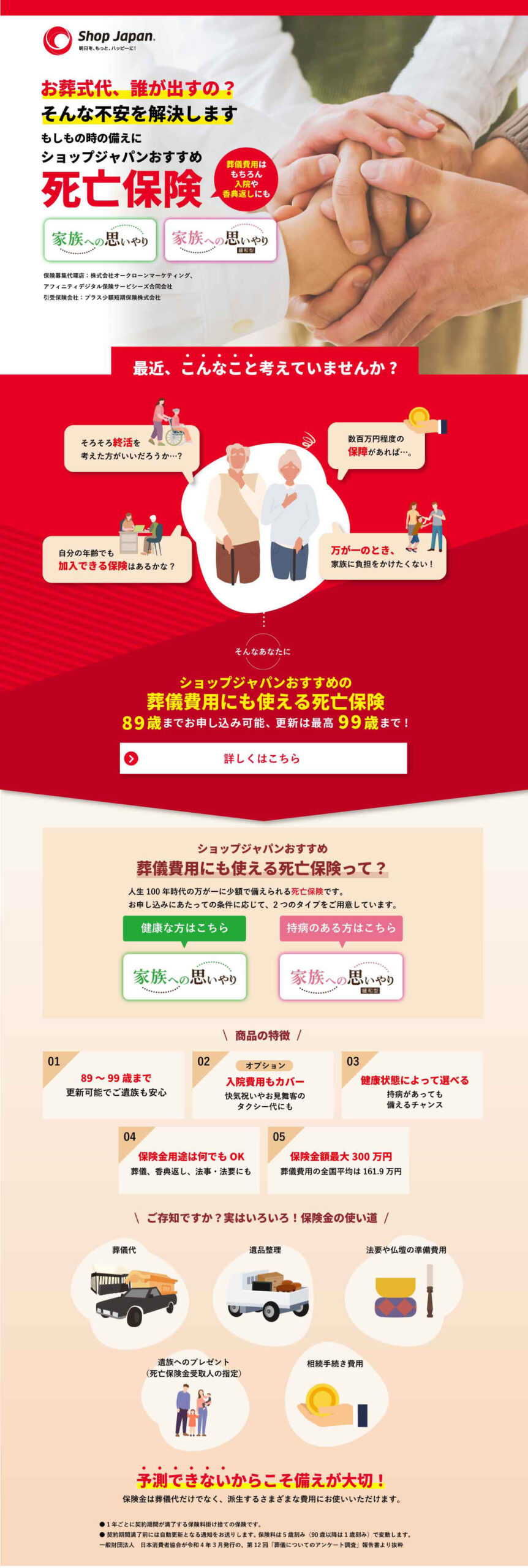 「万が一の際の葬儀費用や、その前後に発生するさまざまな出費に備えたい方」に向けた死亡保険商品の訴求ページです。葬儀費用の全国平均や実際の支出内訳、保険金の使い道を具体的に示しながら、「いつ・いくら必要になるかわからない不安」を可視化し、少額から備えられる保険という選択肢を分かりやすく提示しています。また、健康状態に応じて選べるプラン構成や、持病がある方でも検討できる点を明確にし、高齢層にも安心して検討してもらえる情報設計となっています。